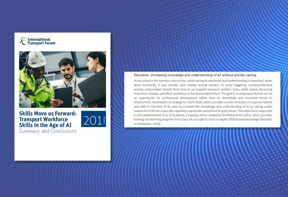 Rəqəmsal İnkişaf və Nəqliyyat Nazirliyindən (RİNN) AZƏRTAC-a bildirilib ki, Beynəlxalq Nəqliyyat Forumunun (BNF) dərc etdiyi “Bacarıqlar bizi irəli aparır: süni intellekt dövründə nəqliyyat sahəsində işçi qüvvəsinin bacarıqları – xülasə və nəticələr” adlı hesabatda ölkəmizin təcrübəsinə xüsusi yer ayrılıb.