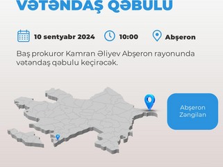 Baş prokuror Kamran Əliyev sentyabrın 10-da, saat 10:00-da Abşeron rayon prokurorluğunun inzibati binasında Abşeron və Zəngilan rayon sakinlərinin qəbulunu keçirəcək.Bu barədə “Report”a Baş Prokurorluğun mətbuat xidmətindən məlumat verilib.Bildirilib ki, vətəndaşların qəbulla bağlı qeydiyyatı və Abşeron rayonuna gəlmələrinin təşkili rayon prokurorları tərəfindən həyata keçiriləcək:”Vətəndaşlar yaşadıqları ərazi üzrə rayon (şəhər) prokurorluqlarına yazılı və ya şifahi müraciət etməklə yanaşı, Baş Prokurorluğun Sənədlərlə və müraciətlərlə işin təşkili idarəsinin (012) 361-01-48 nömrəli telefonu, contact@prosecutor.gov.az elektron poçt ünvanı, həmçinin prokurorluğun sosial şəbəkələrdəki səhifələri (İnstagram, Facebook və X) vasitəsilə də qəbula yazıla bilərlər”.