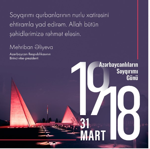 Birinci vitse-prezident Mehriban Əliyeva sosial şəbəkə hesabında 31 Mart – Azərbaycanlıların Soyqırımı Günü ilə bağlı paylaşım edib.