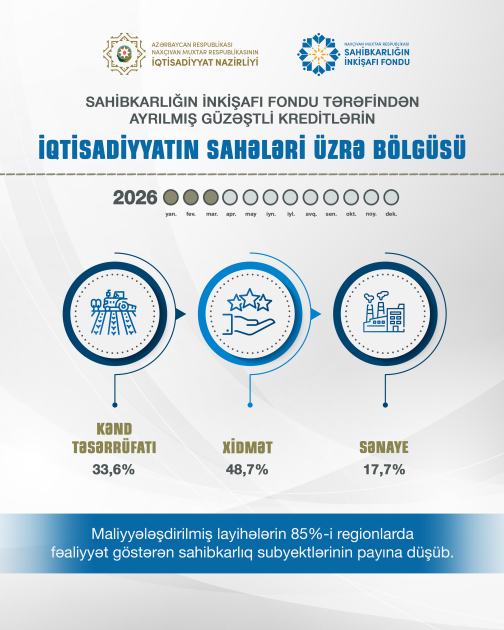 Naxçıvan Muxtar Respublikasının Sahibkarlığın İnkişafı Fondu tərəfindən 2026-cı ilin yanvar–mart ayları ərzində ayrılmış güzəştli kreditlərin 33,6 faizi kənd təsərrüfatı, 48,7 faizi xidmət, 17,7 faizi isə sənaye sahələrinə yönəldilib.