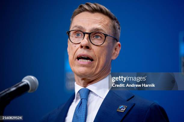 WASHINGTON, DC - JULY 10: President Alexander Stub of Finland speaks as he arrives at the 2024 NATO summit on July 10, 2024 in Washington, DC. NATO leaders convene in Washington this week for its annual summit to discuss future strategies and commitments and mark the 75th anniversary of the alliance's founding. (Photo by Andrew Harnik/Getty Images)